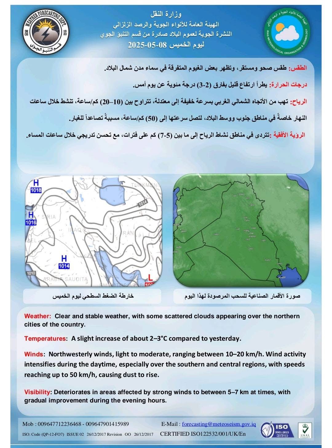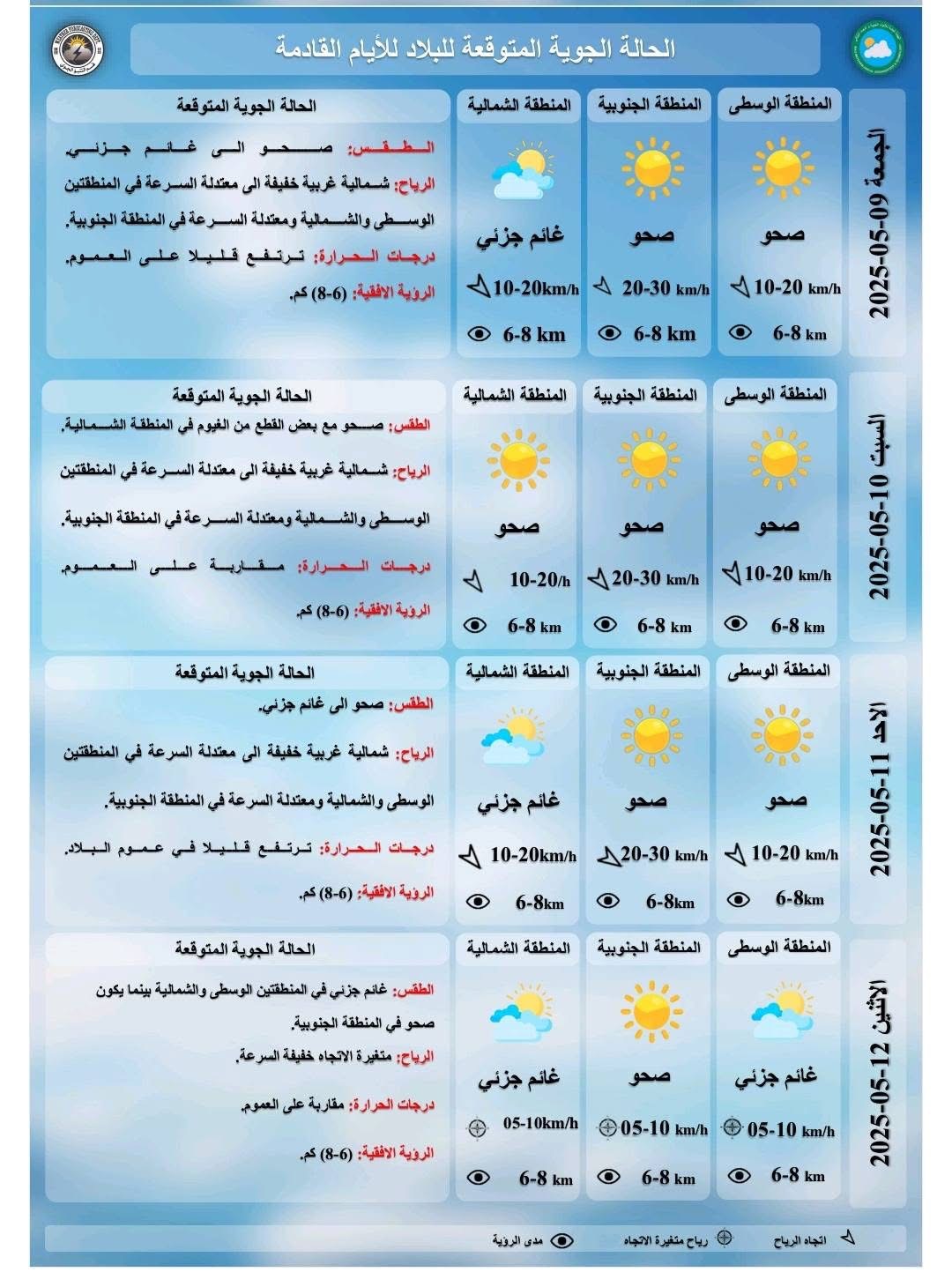 وتوقعت الهيئة "هبوب رياح من الأتجاه الشمالي الغربي بسرعة خفيفة إلى معتدلة، تتراوح بين (10-20) كم / ساعة، تنشط خلال ساعات النهار خاصةً في مناطق جنوب ووسط البلاد، لتصل سرعتها إلى (50) كم/ ساعة، مسببة تصاعداً للغبار".