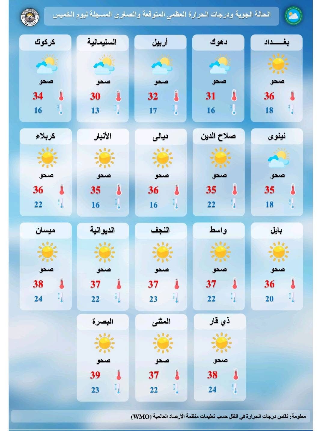 وسجلت العاصمة بغداد درجة حرارة صغرى بلغت 18 وعظمى 36 درجة، فيما سجلت كربلاء، وسط البلاد، 22 درجة صغرى و 36 درجة عظمى.