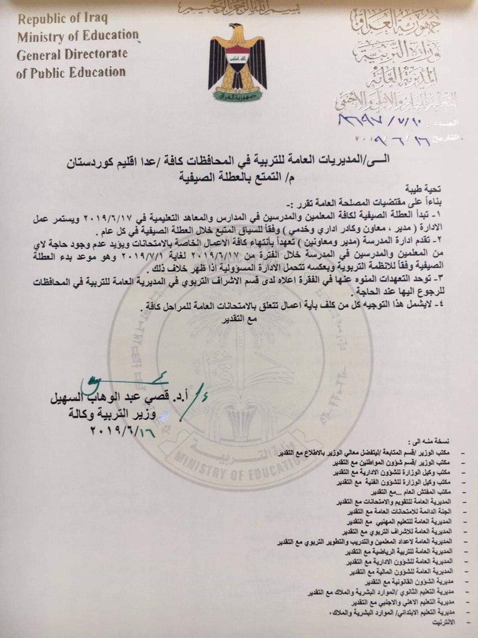 اعلنت وزارة التربية، يوم الاثنين، موعد بدء العطلة الصيفية للمحافظات كافة عدا اقليم كردستان العراق.
