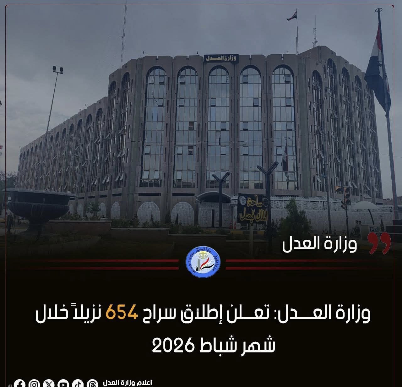 أعلنت وزارة العدل، اليوم الاثنين، إطلاق سراح 654 نزيلاً خلال شهر شباط الماضي في بغداد وعدد من المحافظات.